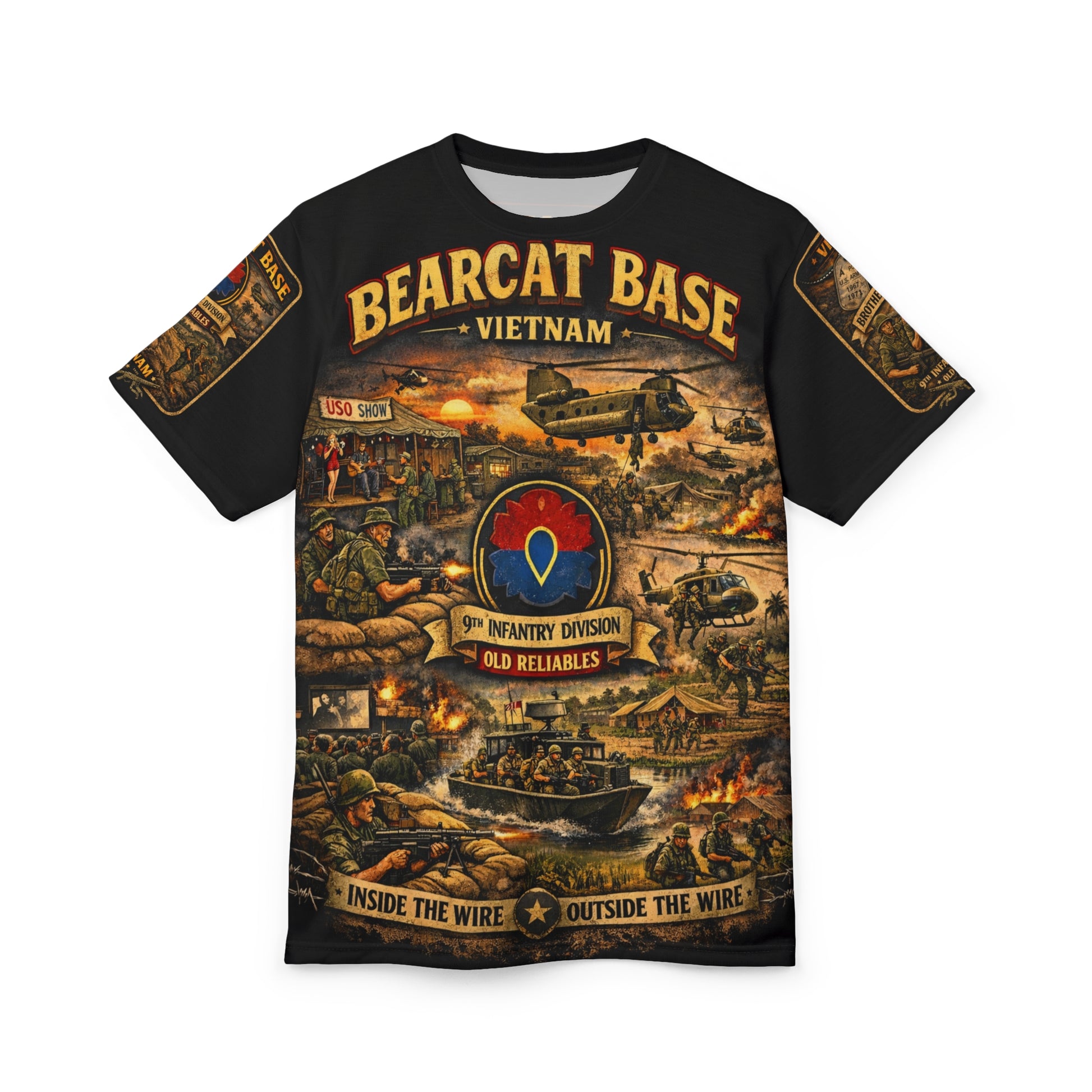 This all-over print tee pays tribute to the legendary 9th Infantry Division "Old Reliables" and their service at Bearcat Base during the Vietnam War. Featuring authentic historical design elements, this shirt honors the courage, dedication, and sacrifice of the soldiers who served with one of America's most distinguished infantry divisions.