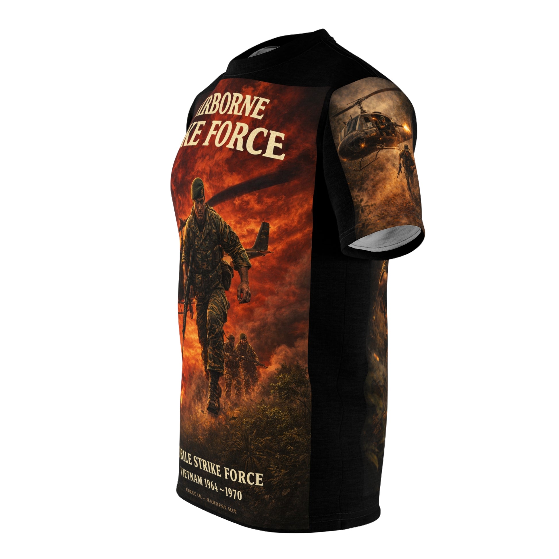 This tribute tee honors the Airborne Mobile Force and MACV-SOG with the powerful motto "Help Is on the Way"—words that carried life-or-death meaning for reconnaissance teams operating deep in enemy territory during the Vietnam War. The design speaks to the legacy of those who answered the call when others were in extremis, providing rapid reaction and extraction support in the most hostile environments imaginable.