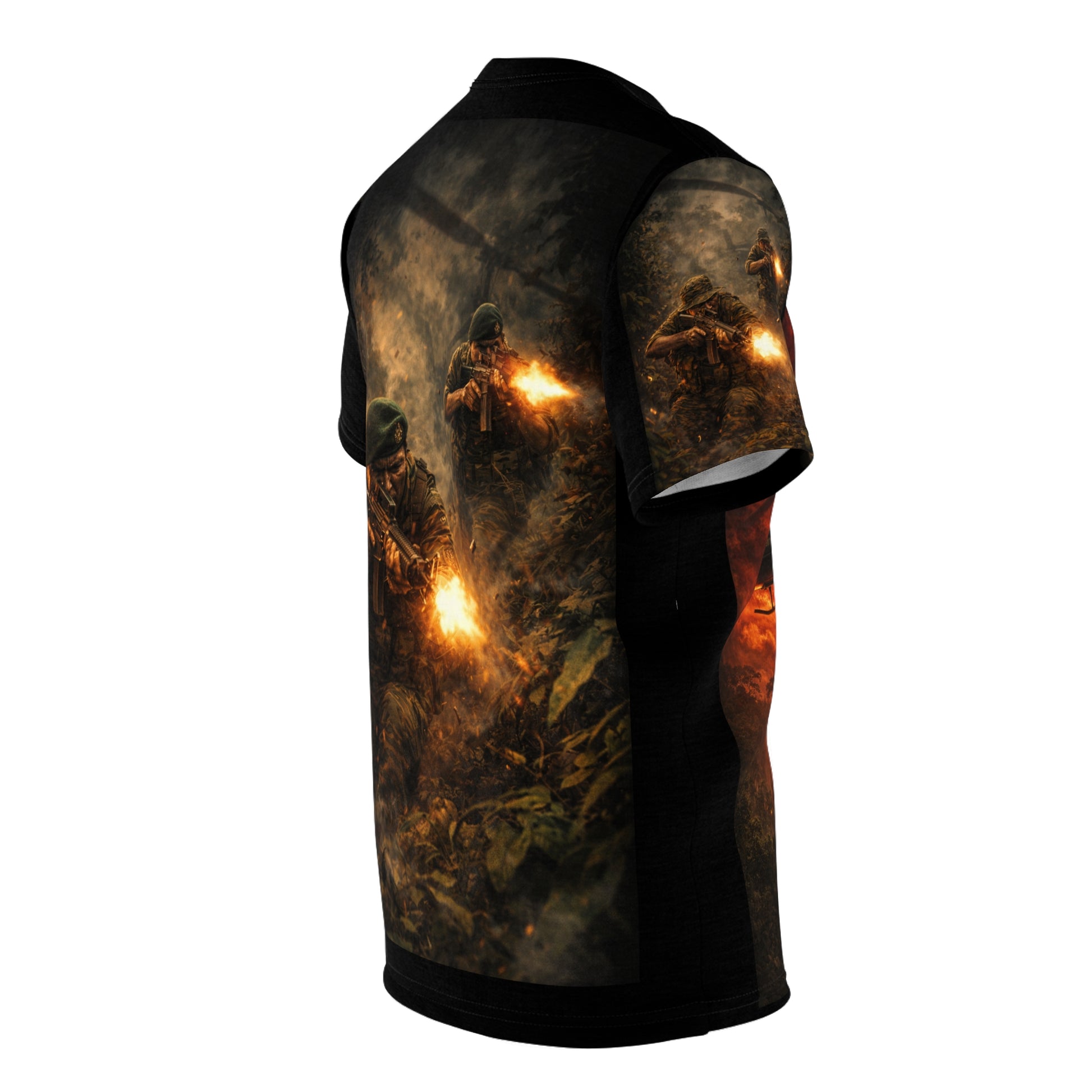Engineered with the same attention to detail you'd expect from operational gear, this cut-and-sew shirt features durable 100% polyester that holds its shape and stays crisp through long days. The fabric has a subtle sheen that ensures the graphic reads clearly whether you're at a memorial ride, veteran meetup, or layering it under a field jacket. It drapes with the comfortable structure of a uniform shirt you'd reach for when you want to feel grounded—close-fitting but never restrictive.