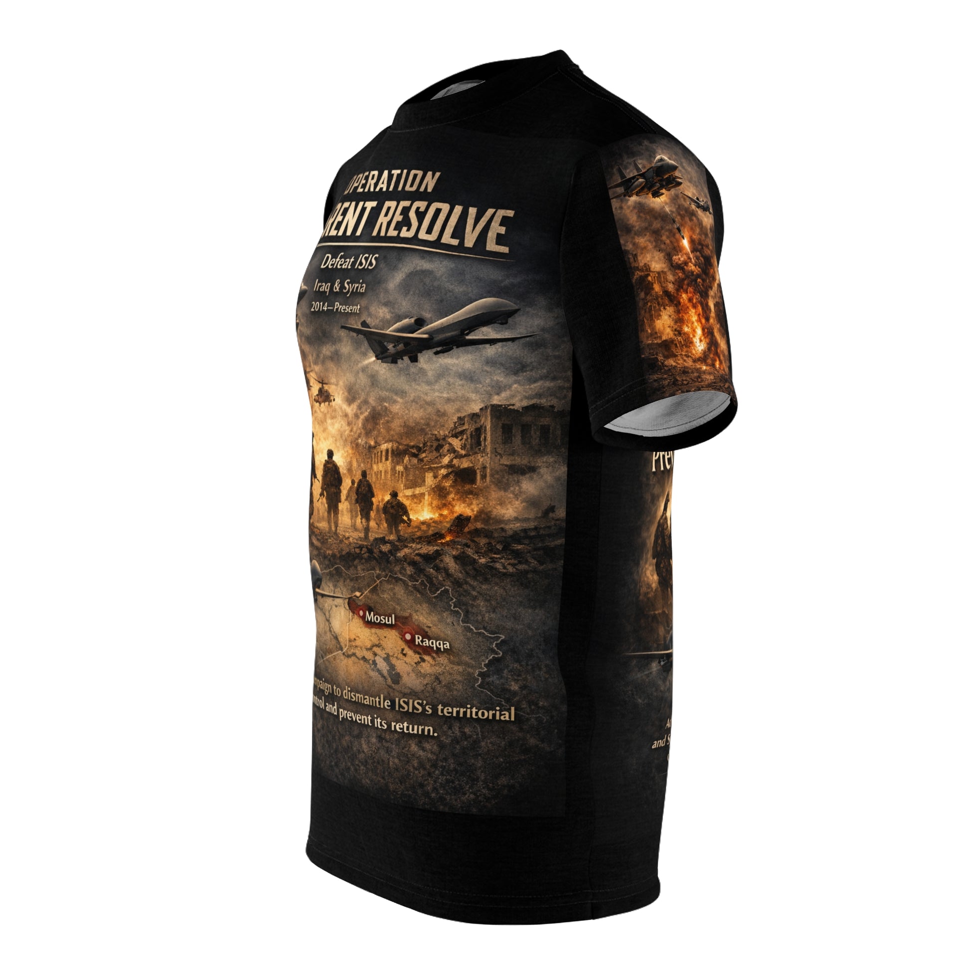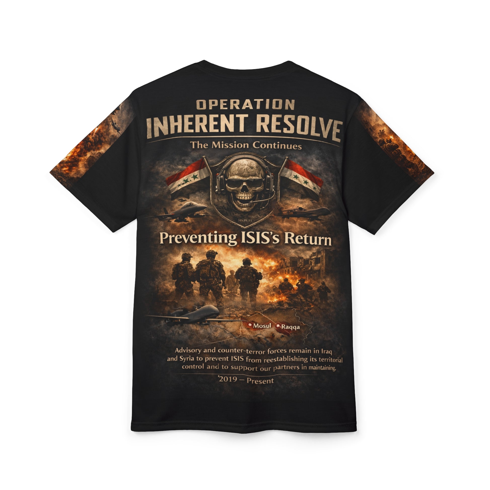 This tribute tee carries quiet strength — honoring those who served in Operation Inherent Resolve and the stand against ISIS. The design reads like a wearable salute: understated, resolute, and steady. The all-over print construction delivers crisp, continuous imagery across premium polyester that holds sharp details without fading, so the commemorative graphic stays clear through long days and repeated wear.