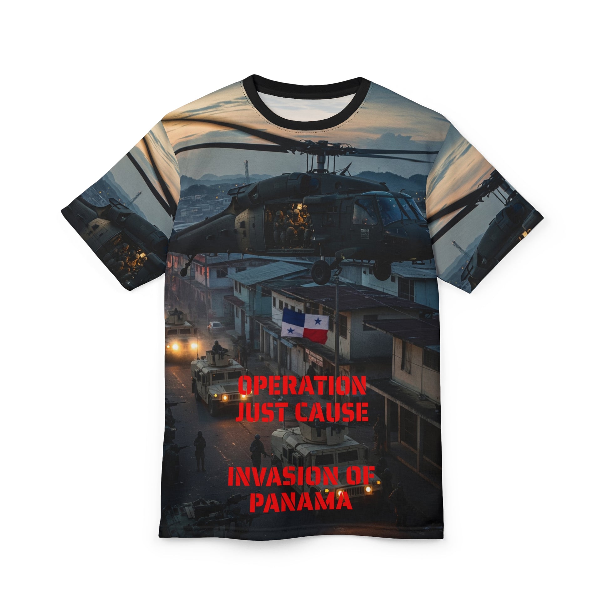 This all-over print tee honors Operation Just Cause—the 1989 U.S. military intervention in Panama that removed dictator Manuel Noriega and restored democracy. Featuring authentic historical design elements, this shirt pays tribute to the courage, precision, and professionalism of the American service members who executed one of the most successful joint military operations in modern history.